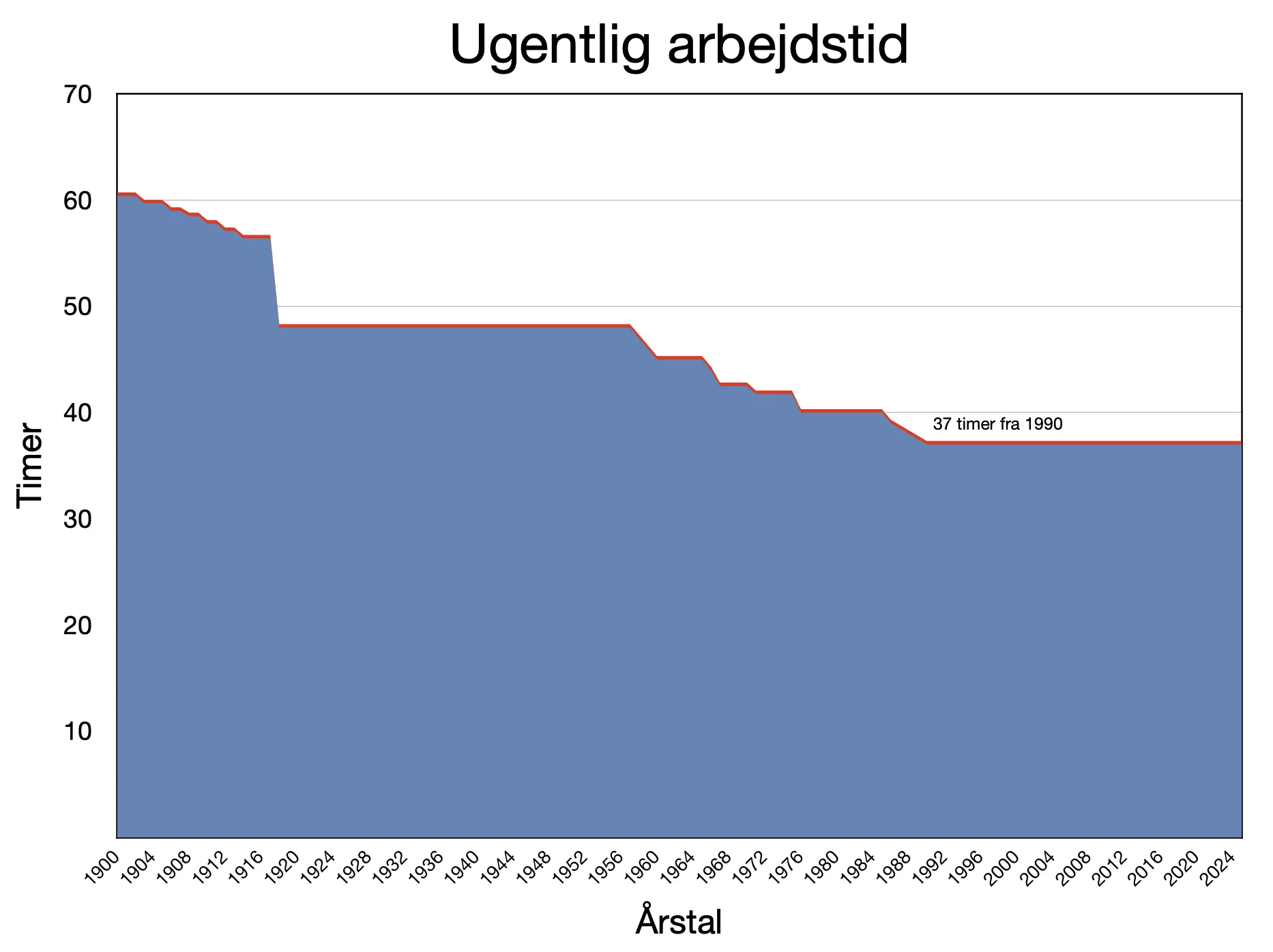Arbejdstiden for den enkelte arbejdstager er faldet fra over 60 timer om ugen omkring år 1900 til 37 timer i 1990*.